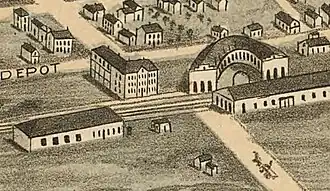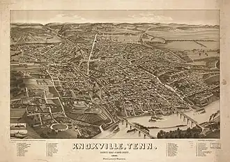 The History of Knoxville, Tennessee, began with the establishment of James White's Fort on the Trans-Appalachian frontier in 1786.[1] The fort was chosen as the capital of the Southwest Territory in 1790, and the city, named for Secretary of War Henry Knox, was platted the following year.[1] Knoxville became the first capital of the State of Tennessee in 1796, and grew steadily during the early 19th century as a way station for westward-bound migrants and as a commercial center for nearby mountain communities.[1] The arrival of the railroad in the 1850s led to a boom in the city's population and commercial activity.[1]