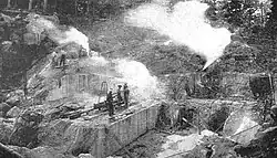 The railroad also led to a boom in the quarrying and production of Tennessee marble, a type of crystalline limestone found in abundance in the ridges surrounding Knoxville. By the early 1890s, twenty-two quarries and three finishing mills were in operation in Knox County alone, and the industry as a whole was generating over a million dollars in annual profits.[42]: 204–6 Tennessee marble was used in monumental construction projects across the nation, earning Knoxville the nickname, "The Marble City," during the late 19th century.[2] The Flag of Knoxville, Tennessee incorporates the color white to symbolize marble and displays a derrick used in marble mining.[46]