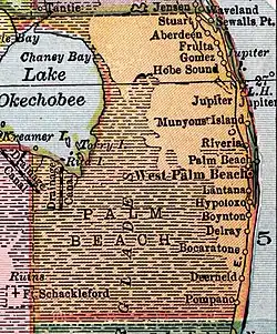 The Bijou, the area's first theater, opened in West Palm Beach in 1908.[37] Palm Beach County, a newspaper which later became The Palm Beach Post, began publishing and circulating weekly editions in 1909.[40] The 1900s decade also marked the beginning of extensive land usage in the Lake Okeechobee region. The Everglades Drainage District, formed by the Florida state government in 1907, sold large tracts of land in western Palm Beach County between 1908 and 1910.[41] Settlers arrived in this section of the county around this time, with Canal Point and Ritta Island being settled by 1909,[42][43] although Kreamer Island had been a fishing and agricultural outpost since the late 1800s.[43]