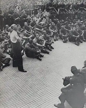 In December 1943, some 65,000 factory workers in Sesto crossed their arms and went into a struggle with over a million workers in Milan, and for eight days war production was completely paralyzed. Factory employees for the first time stood in solidarity with the workers and came out openly in struggle. The consciousness-raising of the working masses was now accomplished. The Agitation Committees were born, in which men and women linked to the Communist Party of Italy, the Christian Democracy and the Italian Socialist Party of Proletarian Unity concurred: these committees had the task of directing, supporting and guiding workers to resistance and non-cooperation with the Nazi-Fascists. They performed a delicate service of covering and assisting compromised, deported and persecuted people and their families, and maintained relations with the C.L.N.'s finance committee.[52]