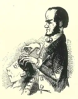 In England mesmerism was championed by John Elliotson, Professor of Practical Medicine at University College London and the founder and president of the London Phrenological Society.[73] A prominent and progressive orthodox physician, he was President of the Medico-Chirugical Society of London and an early adopter of the stethoscope in English medical practice.[74] He had been introduced to mesmerism in the summer of 1837 by the French physician and former student of Mesmer, Dupotet, who is credited as the most significant cross-channel influence on the development of mesmerism in England.[75] Elliotson believed that animal magnetism provided the basis for a consideration of the mind and will in material terms thus allowing for their study as medical objects.[76] Initially supported by The Lancet, a reformist medical journal,[77] he contrived to demonstrate the scientific properties of animal magnetism as a physiological process on the predominantly female charity patients under his care in the University College Hospital.[76] Working-class patients were preferred as experimental subjects to exhibit the physical properties of mesmerism on the nervous system as, being purportedly more animalistic and machine-like than their social superiors, their personal characteristics were deemed less likely to interfere with the experimental process.[78] He sought to reduce his subjects to the status of mechanical automata claiming that he could, through the properties of animal magnetism and the pacifying altered states of consciousness which it induced, "play" their brains as if they were musical instruments.[79]