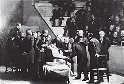 By 1775 Mesmer's Austrian practice was prospering and he published the text Schrieben über die Magnetkur an einen auswärtigen Arzt which first outlined his thesis of animal magnetism.[63] In 1778, however, he became embroiled in a scandal resulting from his treatment of a young, blind patient who was connected to the Viennese court and relocated to Paris where he established a medical salon, "The Society of Harmony", for the treatment of patients.[64] Recruiting from a client-base drawn predominantly from society women of the middle- and upper-classes, Mesmer held group séances at his salubrious salon-clinic which was physically dominated by a large, lidded, wooden tank, known as the baquet, containing iron, glass and other material that Mesmer had magnetized and which was filled with "magnetized water".[65] At these sessions patients were enjoined to take hold of the metal rods emanating from the tub which acted as a reservoir for the animal magnetism derived from Mesmer and his clients.[66] Mesmer, through the apparent force of his will – not infrequently assisted by an intense gaze or the administration of his wand – would then direct these energies into the afflicted bodies of his patients seeking to provoke either a "crisis" or a trance-like state; outcomes which he believed essential for healing to occur.[67] Patient proclamations of cure ensured that Mesmer enjoyed considerable and fashionable success in late-eighteenth-century Paris where he occasioned something of a sensation and a scandal.[67]
