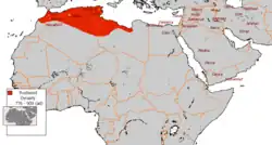 A Kharijite remnant established a state (776–909) under the Rustamids, whose capital was at Tahert (located in the mountains southwest of modern Algiers).[109] Apart from the lands surrounding Tahert, Rustamid territory consisted of largely the upland steppe or "pre-Sahara" that forms the frontier between the better watered coastal regions of the Maghrib and the arid Sahara desert. As such, its territory extended in a narrow climatic strip eastward as far as Tripolitania and Jebel Nefusa (in modern Libya). In between lay southern Ifriqiya, where Rustamid lands included the oases of the Djerid, with its chotts (salt lakes), and the island of Djerba.[110] The functionality of this elongated geography may be explained by the liberal nature of the Rustamid government: "[T]he imam did not so much rule or govern the surrounding tribes as preside over them, his authority being recognized rather than imposed and his mediation in disputes willingly sought."[111] As such this Rustamids territory ran from Tlemcen in the west to Jebel Nefusa in the east.