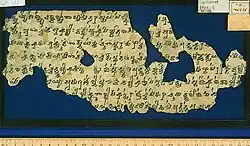 Manuscripts preserve the Tocharian language, a branch of the Indo-European language family spoken in the Tarim Basin of western China between the 5th century and the 8th century and likely extinct by the 9th century. The documents record three closely related languages, called Tocharian A (also East Tocharian, Agnean, or Turfanian), Tocharian B (West Tocharian or Kuchean), and Tocharian C (Kroränian, Krorainic, or Lolanisch). The subject matter of the texts suggests that Tocharian A was more archaic and used as a Buddhist liturgical language, while Tocharian B was more actively spoken in the entire area from Turfan in the east to Tumshuq in the west. Tocharian C is only attested in a few Kharoṣṭhī script texts from Krorän, as well as a body of loanwords and names found in Prakrit documents from the Lop Nor basin.[77]
