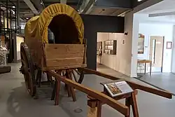 Reconstruction of a lightweight cart that was designed to support the Duke of Marlborough's army. Pulled by two horses in tandem, it was narrow enough to easily pass other wagons and maneuvre through narrow gaps. The large wheels enabled it cross uneven or soft ground.