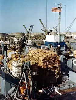 In the North African campaign, the Italians struggled to supply their forces through the inadequate ports in Libya, while the British had access to the Suez. In the Siege of Tobruk, destroyers were used to resupply the garrison, as freighters were too vulnerable to air attack. At the same time, retention of the port stretched the German and Italian supply lines, making offensive action into Egypt more difficult.[145] Resupplying the garrison of Malta was even more hazardous, requiring major operations,[146] as were the Arctic convoys that brought aid to the Soviet Union,[147] so much so that they had to be suspended in July and August 1942. Safer routes were developed through Iran and Siberia, and the Black Sea after it was reopened in 1945.[148][149]