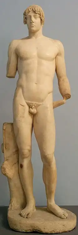 At the festival there were races for maidens of various ages. Their course was 500 feet, or one-sixth less than the men's stadium. The maidens ran with their hair down their backs, a short tunic reaching just below the knee, and their right shoulder bare to the breast. The victors received crowns of olive and a share of the heifer sacrificed to Hera. They had, too, the right of setting up their statues in the Heraeum.[73]