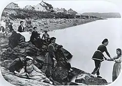 In the 19th century, the woman's double suit was common, comprising a gown from shoulder to knees plus a set of trousers with leggings going down to the ankles. In the first half of the 19th century, the top became knee-length, while an ankle-length drawer was added as a bottom. By the second half of the 19th century, in France, the sleeves started to vanish, the bottom became shorter to reach only the knees and the top became hip-length and both became more form fitting.[2][5] In the 1900s, women wore wool dresses on the beach that were made of up to 9 yards (8.2 m) of fabric.[7]