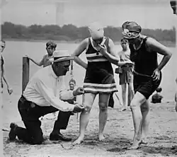 A policeman enforcing the six-inch (15 cm) distance between knee and bathing suit ordinance in 1922, Washington, D.C.