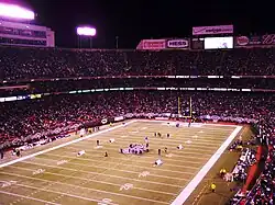 Baugh invited some 100 players to the Titans' first training camp, which opened at the University of New Hampshire on July 9, 1960.[13] As NFL teams cut players from their training camps, many were invited to the Titans' or other AFL teams' training camps as the teams sought to fill their 35-man rosters.[14] The franchise's first preseason game took place on August 6, 1960, against the Los Angeles Chargers at Los Angeles Memorial Coliseum. The Titans kicked off to begin the game, and Chargers running back Paul Lowe returned the kick 105 yards for a touchdown. New York lost, 27–7.[15] On September 11, 1960, the opening regular season game was played in a heavy downpour, the remains of Hurricane Donna. Water poured off Coogan's Bluff, situated above the Polo Grounds, swamping the field, which had poor drainage. The Titans' offense was less affected by the mud than that of the visiting Buffalo Bills. The Titans won the game 27–3 before a crowd of 9,607 (5,727 paid attendance).[16] The following week New York played another home game, against the Boston Patriots. On the first of many occasions when the team would lose a game after taking a big lead, the Titans were ahead 24–7 in the second half. With the lead reduced to 24–21, the Titans punted from deep in their own territory with seconds left. The punter, Rick Sapienza, fumbled the snap, and the Patriots recovered in the end zone for the victory.[17] The following week, with the Titans playing at the Denver Broncos, New York blocked a punt on the final play to win the game.[18] In their fourth game, New York had a two-point lead when it fumbled with fifteen seconds left against the Dallas Texans. This set off a scramble for the ball, which the Titans recovered as time ran out. Viewers in New York were spared the harrowing ending; in a prelude to the Heidi Game eight years later, the local ABC station had switched to a Walt Disney Davey Crockett special at 6:30 p.m. Many viewers called to complain.[19]