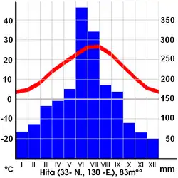 Hita has a humid subtropical climate (Köppen climate classification Cfa). As a basin, the change in temperature from day to night during summer and winter is steep. Hita has a high annual precipitation rate, with over one third of the rain falling during the rainy season months of June and July. Heavy rainfall is frequent, and severe flood damage has occurred in the past. From spring to autumn, a deep fog known locally as sokogiri (底霧, shallow ground fog) often appears in the morning.