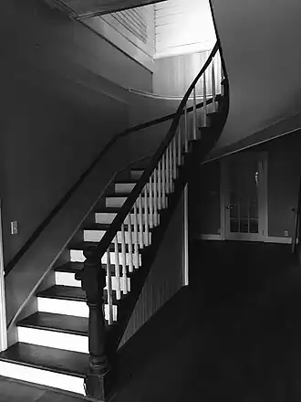 The home also has a number of other distinctive features which were not noted in the National Register description. The pedimented Pediment gabled dormers mentioned feature detailed wood fretwork, typical of the early decades of the 19th century. This wooden ornamentation is also present on the double screen doors and are likely an early, if not original, feature of the house. The interior of the home features a wide central hallway which showcases a dramatic winding staircase. The rooms on the first floor feature 12 ft. ceilings and two centrally located chimneys allow for each of the four principal first floor rooms to have its own fireplace. These fireplaces, which were originally configured to burn wood were later modified to use coal, and later blocked off altogether for use of propane/gas heaters.