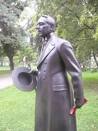 Statue of Hjalmar Söderberg in front of the National Library of Sweden in Humlegården, Stockholm.