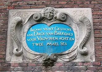 Poem above the entrance of the hofje at the Bakenessergracht: "Ingang van t Gesticht van Dirck van Baekenes voor Vrouwen acht en twee mael ses".