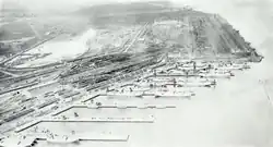 The first ship, named SS Quistconck for the Lenape name for the site, was christened August 5, 1918, by Edith Bolling Wilson, wife of U.S. President Woodrow Wilson.[2] The shipbuilding process practiced on Hog Island was an early experiment in standardized construction of ships. The ships built there, known as "Hog Islanders", were considered ugly but well-built. In all, 122 Hog Islanders were built, mostly cargo ships, and a few troop transport ships. The shipbuilding continued until 1921, after which the facility was rapidly demolished. None of the ships were ready in time to participate in World War I, but many of them were involved in World War II. Two of the locomotive steam gantry cranes were sold as surplus to the city of Trenton, New Jersey, where they remain today as the Hog Island Cranes, listed on the National Register of Historic Places.[3] Another crane, a 20-ton industrial locomotive crane, was sold to the Hyde, McFarlan & Burke contracting company.[4]