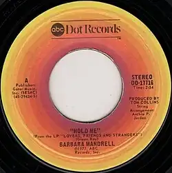 "Hold Me" was released as a single on ABC/Dot Records in August 1977. It was backed on the B-side by the song "This Is Not Another Cheatin' Song". The track was issued by the label as a seven inch vinyl single.[4] The single spent 14 weeks on America's Billboard country songs chart, peaking at number 12 by October 1977.[5] In Canada, the single climbed to the number 14 position on the RPM country chart.[6] The song was released on Mandrell's third ABC/Dot studio album called Lovers, Friends and Strangers.[7]
