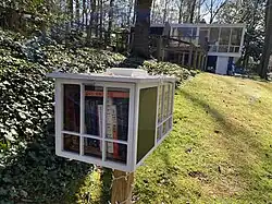 The nearest public libraries to Hollin Hills are the Sherwood Regional Library (opened in 1971[36]) and Martha Washington Library (opened at its current location in 1961[37]) served by the Fairfax County Public Library (FCPL) system. In addition, several residents have installed and maintain neighborhood book exchanges and chartered Little Free Library locations throughout the neighborhood, often stylized in the shape of mid-century modern homes found throughout the community.