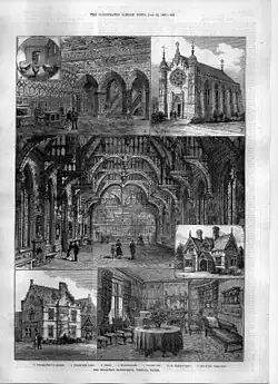 By the time the institution was ready to admit patients, new regulations had come into force, and Crossland had to revise the internal arrangements to comply with the new safety regulations. Interior decoration was lavish: the great recreation hall with a grand beamed roof was decorated by the Scottish architect and designer John Moyr Smith at a cost of £400.[5]