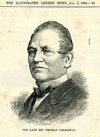 Thomas Holloway was a Victorian entrepreneur who made a fortune from the sale of his patent medicines, pills and ointments, designed to cure all ills.[1]