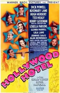 The film was based on the popular Hollywood Hotel radio show created by gossip columnist Louella Parsons, where Hollywood stars recreated scenes from their latest movies. It was broadcast weekly from the hotel of that name.[1] The film's recreation of the program features Louella Parsons, Frances Langford, Raymond Paige and His Orchestra, Jerry Cooper, the announcer Ken Niles, Duane Thompson and Benny Goodman and His Orchestra.