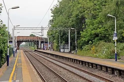 Holmes Chapel railway station serves the village of Holmes Chapel in Cheshire, England. It is located 8½ miles (14 km) north-east of Crewe on the Crewe to Manchester Line.