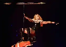 The mashup performance of "Holy Water" and "Vogue" on the Rebel Heart Tour saw Madonna standing on a dancer while twirling on a cross.