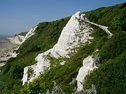 Weircombe Cottage is shown on higher ground to the east of the Pinnacle in the 1875 map. This seems to have had no connection with the fishermen's cottages.[2] During the inter-war years, it was occupied by the actress and singer Winifred Barnes (1892–1935), and her sister. The latter continued to live at the cottage after Winifred's death. By that time it was the property of the Council. Local auctioneers Edgar Horn cleared the cottage and sold the contents; a large amount of silver antiques were found in an outside lavatory before the cottage then only a few feet from the cliff edge was demolished in the late 1980s.