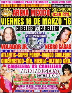 33. ^ a b "Resultados Homenaje a dos Leyedas: ¡Negro Casas y Máximo Sexy, Sin cabelleras!" (in Spanish). Consejo Mundial de Lucha Libre. March 19, 2016. Archived from the original on March 26, 2016. Retrieved March 19, 2016.