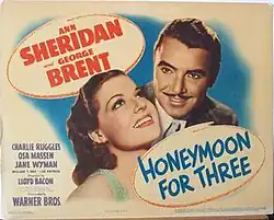 Honeymoon for Three is a 1941 American romantic comedy film directed by Lloyd Bacon and starting Ann Sheridan. George Brent, Charlie Ruggles and Osa Massen. Future star Jane Wyman appears in a supporting role. The film was produced and distributed by Warner Brothers. It is a remake of the 1933 film Goodbye Again, which was itself based on the 1932 play Goodbye Again.[1]