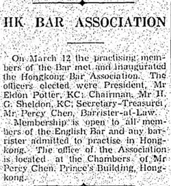 According to its website, the Hong Kong Bar Association was founded in 1949.[1] However, a newspaper advertisement from March 1948 records the foundation of the association on 12 March 1948 with Mr Eldon Potter KC being elected President, Mr H.D. Sheldon KC being elected chairman and Mr Percy Chen being elected Secretary Treasurer. The offices of the Association were located in the offices of Mr Chen in Prince's Building, Hong Kong.[2]