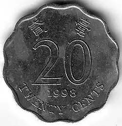 The twenty-cent coin is a coin of the Hong Kong dollar. It is the second-smallest denomination coin in Hong Kong. There have been two different periods of usage for a twenty-cent coin: the first, round twenty-cent was issued from 1866 to 1905, and the current scallop-shaped coin was introduced in 1975.