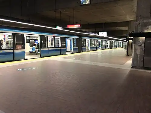 Honoré-Beaugrand station (French pronunciation: [ɔnɔʁe boɡʁɑ̃]) is a Montreal Metro station in the borough of Mercier–Hochelaga-Maisonneuve in Montreal, Quebec, Canada.[4] It is operated by the Société de transport de Montréal (STM) and is the eastern terminus of the Green Line. It is located in the district of Tétreaultville.[4] The station opened on June 6, 1976, replacing Frontenac station as the terminus.