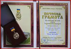 The Honorary Diploma of the Verkhovna Rada of Ukraine is an award[1] of the Verkhovna Rada (parliament) of Ukraine [2] for significant contribution to any sphere of life, outstanding socio-political activities, services to the Ukrainian people[3] in promoting and strengthening Ukraine as a democratic, social, legal state, implementing measures to ensure rights and freedoms of citizens, development of democracy, parliamentarism and civil harmony in society, and active participation in legislative activities.