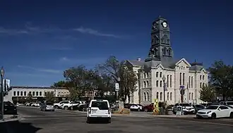 The historic Hood County Courthouse is located in the block bounded by East Bridge Street on the north, North Crockett Street on the east, East Pearl Street on the south and North Houston Street on the west and has an entrance on each side except the north one. It is the fifth courthouse building to occupy this site and was built of Brazos limestone by contractors Moodie and Ellis between 1890 and 1891. It was designed in the Second Empire style by noted Texas courthouse architect Wesley Clark Dodson of Waco (1829–1914). The building features 3 main stories plus an attic floor under an elaborate mansard roof system. The imposing 3-story central clock tower completed after the rest of the building required reinforcement in 1969. In 2000 the exterior of the building was restored. In 2008 a grant was received to restore the interior including restoring the district courtroom to its original 2-story configuration.[5][6]