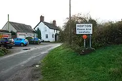 The genesis of the village name of Hopton is of Anglo Saxon origin and comes from the Old English word hop which means an enclosed area, which sometimes refers to remote places in marsh or moorland, or as in the case of Hopton, an enclosed valley. The second part of the name Hopton comes from tun, which in Old English has the meaning farmstead, so giving the village name the whole meaning of the farmstead in the enclosed valley.[6]