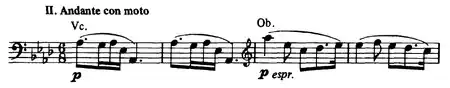 The premiere of Strauss's opera Capriccio was on 28 October 1942. Strauss wrote "My life's work has been concluded with Capriccio. Whatever notes I scribble down now have no bearing on musical history."[1] A couple of days later he drove to Vienna where he was to stay for over 6 months.[2] The horn concerto seems to have been written very quickly: his note book indicates that the draft was finished on 11 November, and the final score two weeks later on the 28th (he added a note at the end "In the beautiful house at Vienna"). The autograph score indicates that it is dedicated "To the memory of my father", although this did not make it into the published version. The speed of composition may reflect that it had been on his mind for sometime, as the principal horn player at Munich, Professor Josef Suttner, had asked him years before to write a second concerto.[3] Strauss also mentioned the second concerto in a program list written in 1941.[4][5]