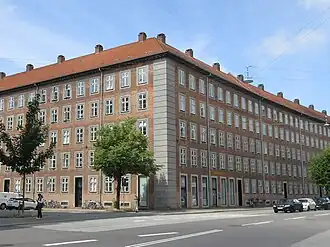 The construction of Borups Allé began in 1902. Many of the new streets in the area around the first part of Borups Allé were named after localities in North Zealand. The street names Hornbækgade (named for Hornbæk) and Skotterupgade (named for Skotterup) were both adopted in the 1910s.[1] The city reserved large areas of land for public housing but development was initially slow due to a low demand for housing at the time. In 1908, Copenhagen had 11,000 empty apartments.[2] A decade later, during the First World War the situation had dramatically changed with increasing housing shortage having become a concern. The first public housing association was established in 1915. In 1922, a government programme was launched to support the construction of housing. This paved the way for the construction of a lot of large housing estates in the periphery of Copenhagen. Hornbækhus was already planned in 1920. It was constructed in 1922–23.[3] The building was designed by the young and still relatively inexperienced architect Kay Fisker. The central garden complex was designed by Gudmund Nyeland Brandt. The trend with constructing particularly large perimeter blocks to a monotonous design was adopted in an attempt to keep construction costs down. Povl Baumann's four residential blocks on Struenseegade was an example of the same approach. Fisker's Hornbækhus continued the approach but in an even larger scale.[4]