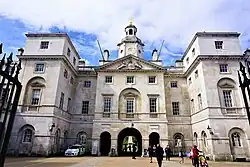 Horse Guards is a historic building in the City of Westminster, London, between Whitehall and Horse Guards Parade. It was built in the mid-18th century, replacing an earlier building, as a barracks and stables for the Household Cavalry. The current and previous buildings were, between the early 18th century and 1858, the main military headquarters for the British Empire. Horse Guards originally formed the entrance to the Palace of Whitehall and later St James's Palace; for that reason it is still ceremonially defended by the King's Life Guard.