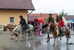 In Slovenia, Christmas is heralded by St. Stephen, the local patron saint of horses. Slovenian legends also have it that King Herod ordered St. Stephen to be captured and tied to a beech tree in the middle of a green forest, where a wild white horse was to tear him to pieces. But when the horse spots St. Stephen, it calms down and follows him to a castle.[58] Finally, the king orders him stoned to death. Horses also pull a coffin containing the deceased saint, as depicted at Utik, near Ljubljana.[58]