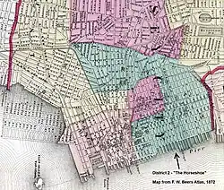 The Horseshoe section of Jersey City, New Jersey, was the second ward, and was the home of the immigrants, tenements, and taverns.[1] The Republican-controlled Legislature gerrymandered the district in 1871 to concentrate and isolate Democratic, and mostly Catholic, votes, thus preserving Republican dominance in the rest of the city.[2] The curved shape of the district was said to resemble a horseshoe.[3]