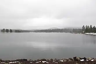 Horseshoe Cienega Lake sits at 8,100 feet (2,500 m) on the Fort Apache Indian Reservation. The lake turnoff is approximately 20 miles (32 km) from Pinetop-Lakeside in the west and approximately 25 miles (40 km) from Eagar to the east. The main parking area and boat launch are about a mile (1.6 km) south of State Route 260, and are accessed by a well-maintained dirt road. Unlike many of the high-altitude White Mountain lakes, Horseshoe Cienega Lake is accessible year-round. Ice fishing is possible when the lake freezes over, typically from late-November until mid-April.[2] The average high temperature at the lake in January is 42 °F (6 °C) compared to an average high of 75 °F (24 °C) in July while the average low temperature in January is 7 °F (−14 °C) compared to average low of 44 °F (7 °C) in July.