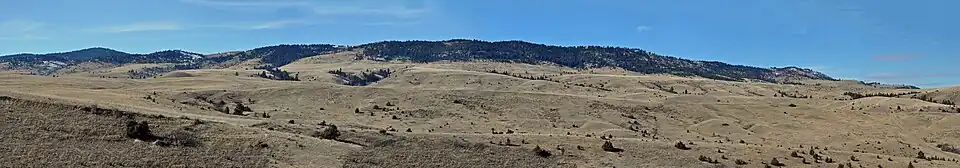 The Horseshoe Hills are a roughly crescent-shaped range of hills north of Manhattan, Montana in Gallatin County, Montana. They lie at 6,673 feet (2,034 m)[1] in the area between the southern Big Belt Mountains and the northern Bridger Range. The hills are bounded on the north by Sixteen Mile Creek (which begins in the Crazy Mountains), the first major tributary of the Missouri River. As they are in the rain shadow of the Boulder, Elkhorn, and Bull Mountains to the west, the Horseshoe Hills are notably dry, receiving 10–12 inches (250–300 mm) of precipitation annually. This is especially true on the southern and southeastern flanks, which are also in the rain shadow of the hills themselves. In the driest areas, Missouri foxtail cacti, plains prickly pear cacti, and yucca abound, as well as prairie rattlesnakes. Much of the hills are private property, but there is also some state, BLM, and National Forest land.