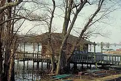 A marina house on the lake built on stilts.