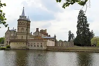 Pevsner describes the approach to the Towers as "one of the most sensational in England".[11] The core of the present house is Barry's building of 1820–1829, undertaken in the Tudor Revival style.[12] This is enveloped with a great hall, built by Lovelace in 1849, and by even larger flanking towers, in Romanesque and Rhenish styles, and a chapel, all dating from 1859 and after, and drawing inspiration from a long European tour Lovelace undertook following Ada's death in 1852.[12] The whole is encircled by a complex of walls, tunnels, arches, bastions and a lengthy cloister.[a][11][12] The construction materials are mainly local flint and brick, Lovelace purchasing a brickworks at Ockham to ensure a ready supply.[4]