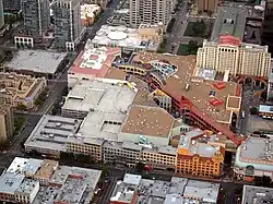 Horton Plaza was a five-level outdoor shopping mall in downtown San Diego, California. It was designed by Jon Jerde and was known for its bright colors, architectural tricks, and odd spatial rhythms, occupying 6.5 city blocks adjacent to the city's historic Gaslamp Quarter. Opening in 1985, it was the first successful downtown retail center since the rise of suburban shopping centers decades earlier.[2]