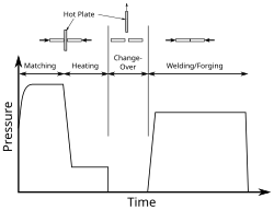 The matching phase serves to match the geometry of the weld surfaces to the theoretical welding plane. The weld surfaces are heated through conduction by physical contact with the hot plate. The hot plate temperature range is 30 to 100 °C (86 to 212 °F) above the melting temperature of the material, and a constant pressure between 0.2 and 0.5 MPa is applied against the hot plate.[1] This causes the weld surfaces to conform to the hot plate, which has the desired weld geometry. This also removes surface irregularities that would increase thermal contact resistance. After the parts are in full contact with the hot plate, the heating phase starts and pressure is reduced to a minimum.