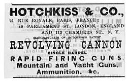Hotchkiss died in 1885, and in 1887 the affairs of both companies were placed under the French corporation and renamed respectively, the Société Anonyme des Anciens Etablissements Hotchkiss et Cie of France and the Hotchkiss Ordnance Company, Ltd. in England.[1]