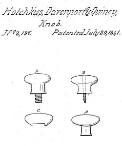 John G. Hotchkiss, John A. Davenport, and John W. Quincy obtained U.S. Patent No. 2197, on making or manufacturing knobs of potter's clay or porcelain. The patent asserted that they: