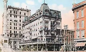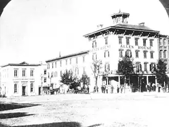 The inn received a face lift and new lease on life under the name of Allen House, which was adopted about 1859.[1] By the late 1870s, with the arrival of stagecoach lines and railroads bringing more guests than ever, the wooden Allen House hotel was falling apart. It was replaced by a six-story brick and steel hotel, the Hotel Allen. Built in the Victorian Style, it was designed to be the grand hotel of the city. Opened in 1882, the six-story, 150 room building’s graceful form defined the northeast corner of Center Square.
