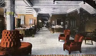 The Allen Hotel's first floor included a large lobby with a luxurious sitting room. All rooms also had electric lighting, and some rooms even had private baths.[1] Also several retail stores, including the Koch and Shankweiler men's clothing store were located. An observation tower, located on the seventh floor, offered a panoramic view of the city. During the 1890s, it was connected to both the Lehigh and Consolidated phone systems, the region's two phone companies.[2]